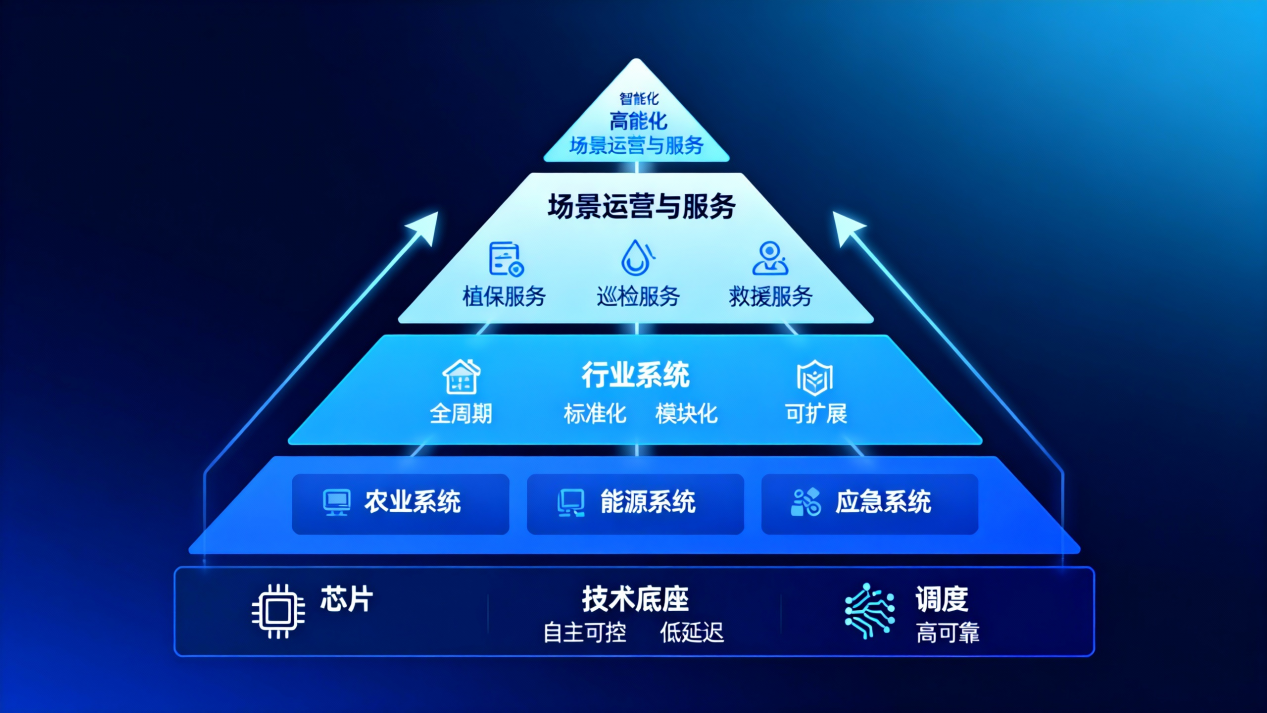 如果把芯璟低空画成一张“业务地图”,最清晰的结构可以拆成三大核心板块:技术底座、行业系统、场景运营与服务。这三块不是各做各的三条业务线,而是一条自下而上、相互支撑的“低空基础设施链路”:底层决定飞得稳不稳,中层决定能不能快速复制交付,顶层决定价值能不能在真实项目里被验证、被沉淀、被放大。